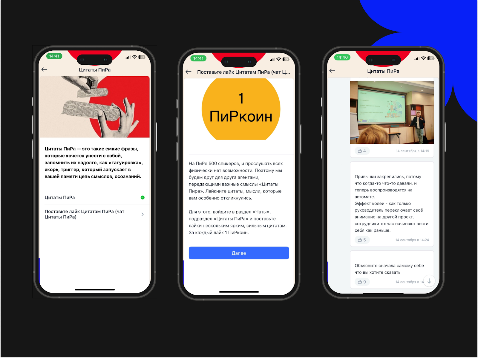 На мероприятии ежегодно выступают более 500 спикеров, а множество докладов проходят одновременно. Участники физически не могут посетить всю насыщенную программу, но выносят для себя важные идеи из тех докладов, на которые всё-таки пришли. В приложении был создан отдельный раздел, где участники могли записывать цитаты и инсайты, полученные на выступлениях. Там же можно было оценивать понравившиеся цитаты и получать за это игровую валюту.