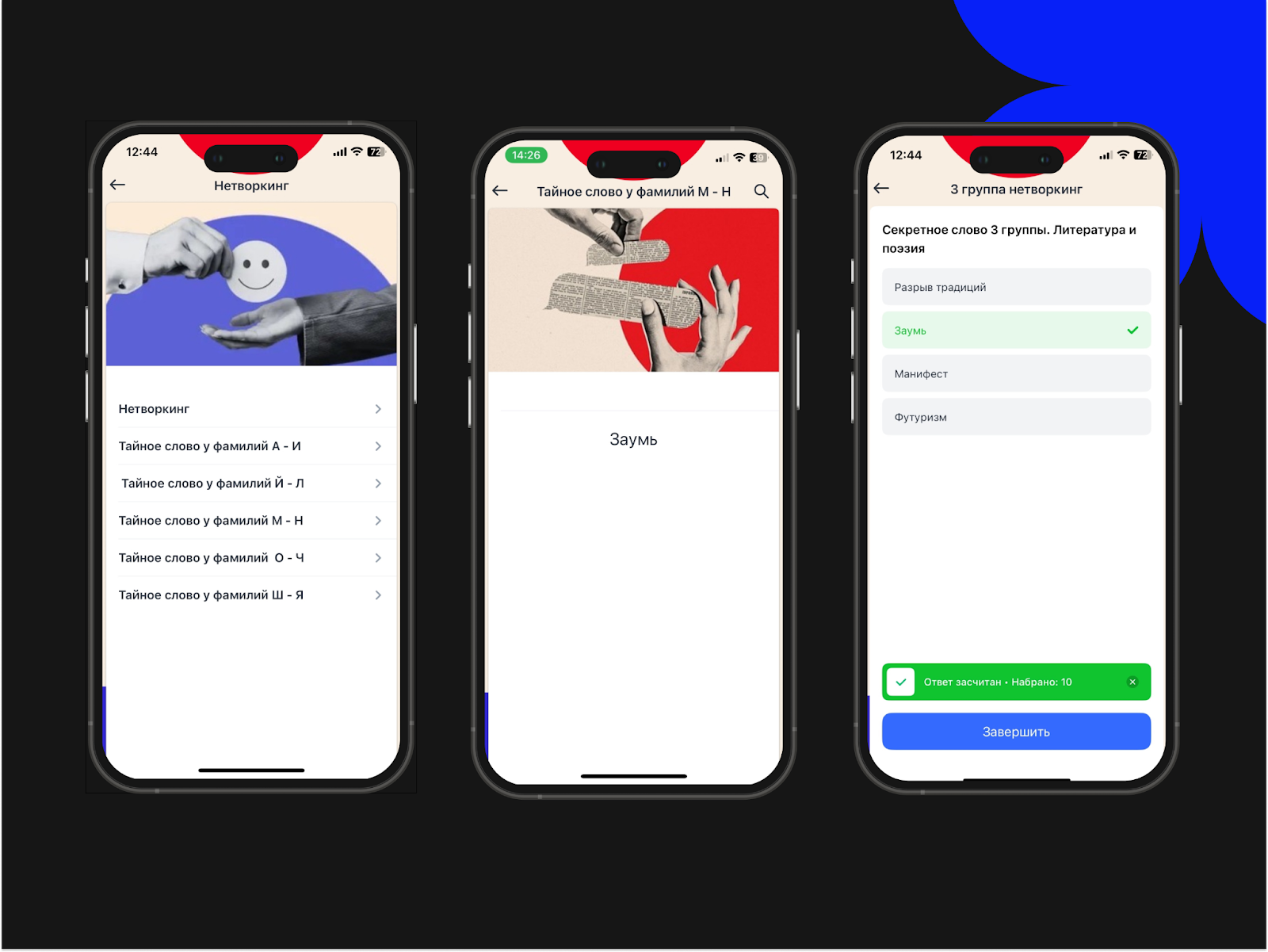 Организаторам было важно, чтобы участники знакомились и общались с удовольствием. Для этого всех разделили на пять групп по алфавиту (по первой букве фамилии). У каждой группы было своё секретное слово, которое другие участники старались узнать, чтобы указать в задании и получить за верный ответ ПиРкоины. Суть механики заключалась в том, чтобы познакомиться с как можно большим числом участников из других групп и узнать все секретные слова.
