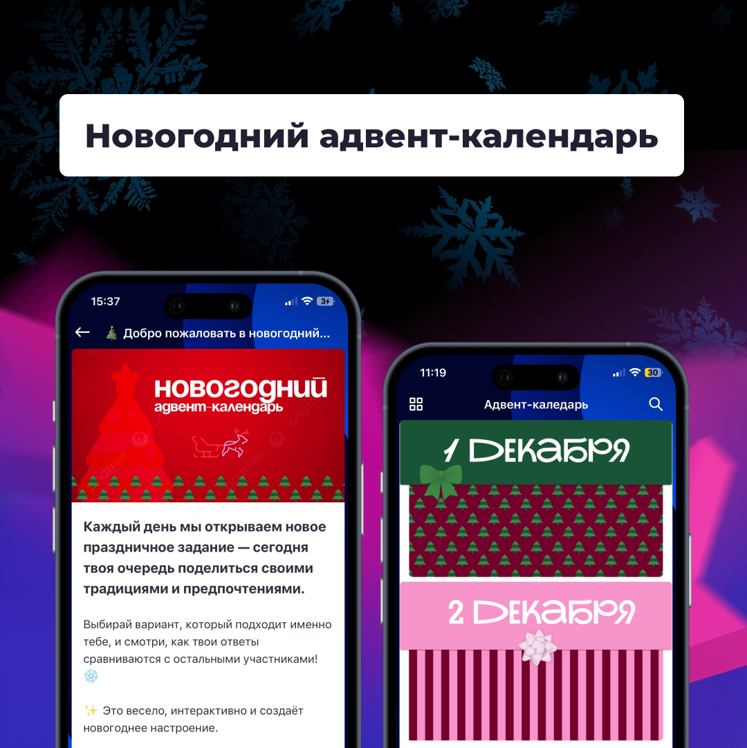 Один из презентов, который остаётся на пике популярности вот уже много лет. Удивите сотрудников нестандартным решением, реализовав адвент-календарь через ежедневные рассылки или цифровую платформу. Например, каждый день будет открываться новое задание с интерактивом и подарком от компании. Это может быть опрос о любимом новогоднем блюде и промокод в супермаркет. Можно распределить задания на месяц и подвести итоги в день корпоратива — онлайн или офлайн.