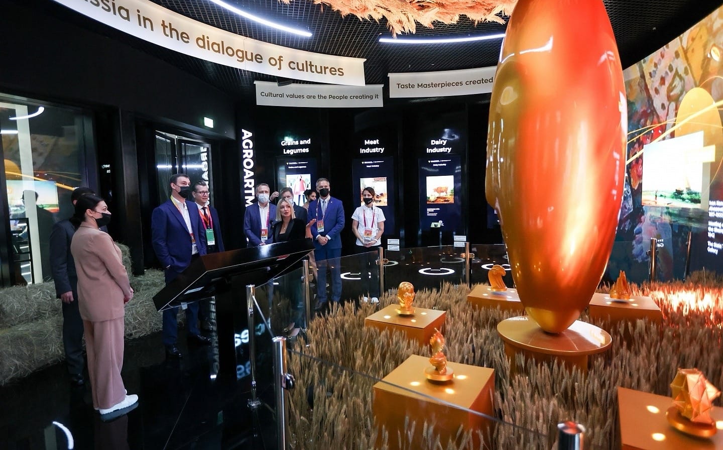 Практический пример – экспозиция для Минсельхоза России на Экспо в Дубае. Команда организаторов создала «Агро-арт-музей»: классические картины с сельскими пейзажами с помощью интерактива превращались в инфографику об успехах агропромышленного комплекса. Центральным объектом стало левитирующее зерно-скульптура с очертаниями лица – символ того, что «хлеб всему голова».