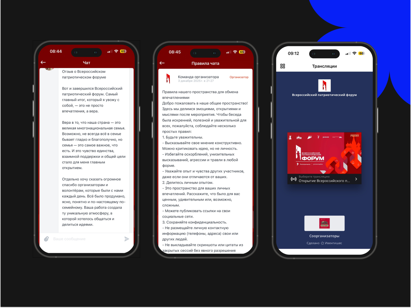 В приложении реализовали чат впечатлений с двумя вкладками. В первой участники знакомились с правилами общения от организаторов — это задавало корректный тон взаимодействия. Во второй вкладке участники общались, обменивались отзывами и делились эмоциями, формируя общее ощущение включённости в единую среду форума.