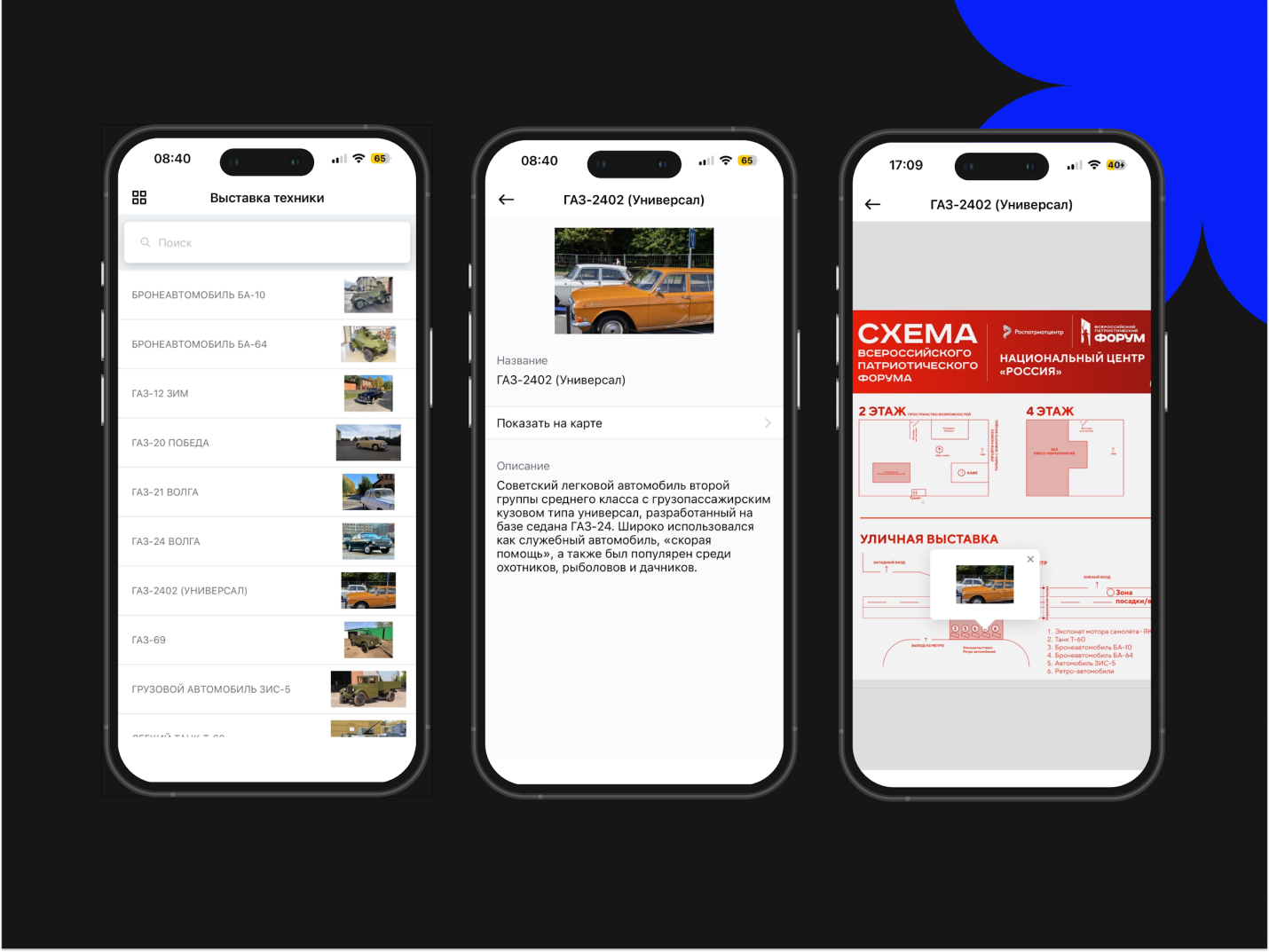 В приложении выставка была представлена отдельным разделом. Участники смотрели карточки экспонатов, где были размещены фотографии и описание каждого объекта. Важно, что цифровая часть была связана с навигацией по площадке. Из карточки участники переходили к схеме и видели, где именно расположен конкретный экспонат.