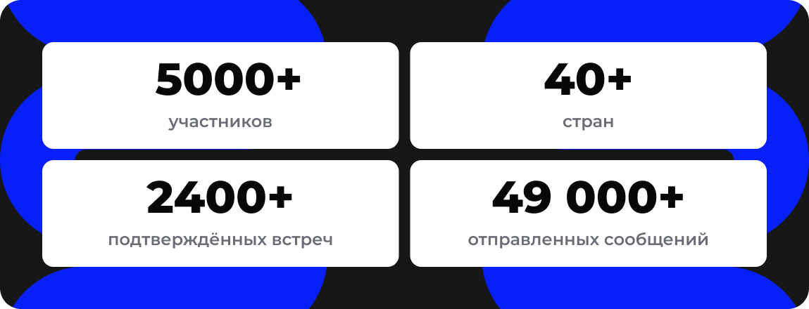 Мы начали работу над проектом в апреле и сразу сделали акцент на бизнес-сценариях пользователей. Для нас было важно, чтобы платформа помогала участникам быстро находить нужные контакты и фиксировать интересы, а организаторам — управлять коммуникациями без лишней операционной нагрузки.