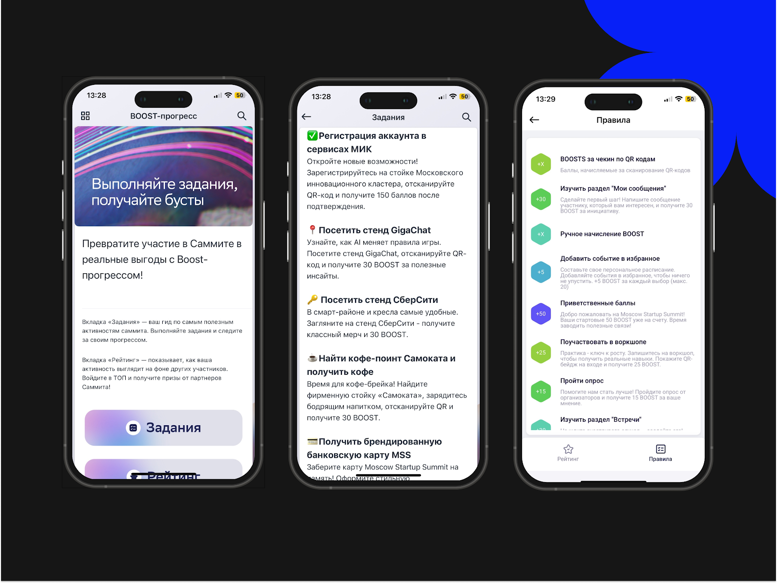 Одним из инструментов вовлечения стал BOOST-прогресс — квест для взаимодействия с партнёрами. Участники выполняли задания из списка: посещали стенды, сканировали QR-коды, размещённые на стендах, общались, переводили средства в благотворительный фонд с помощью «Оплаты улыбкой».