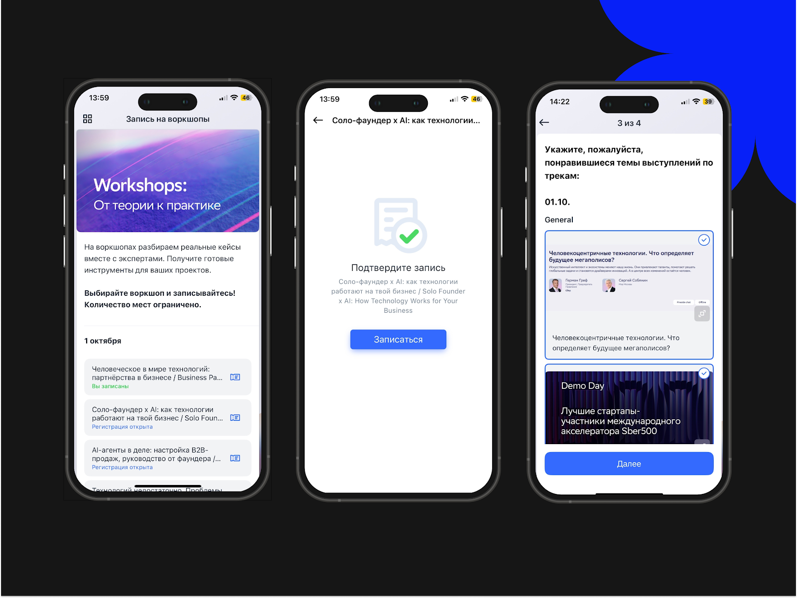 «И мы, и участники остались довольны. Платформа помогла ориентироваться не только в насыщенной программе, но и на самой площадке. Нам удалось понять, какие направления интересуют гостей, что будет актуально в ближайшем будущем», — Антон Старых, руководитель направления Дирекции развития стартап-экосистемы и открытых инноваций (Сбер).
