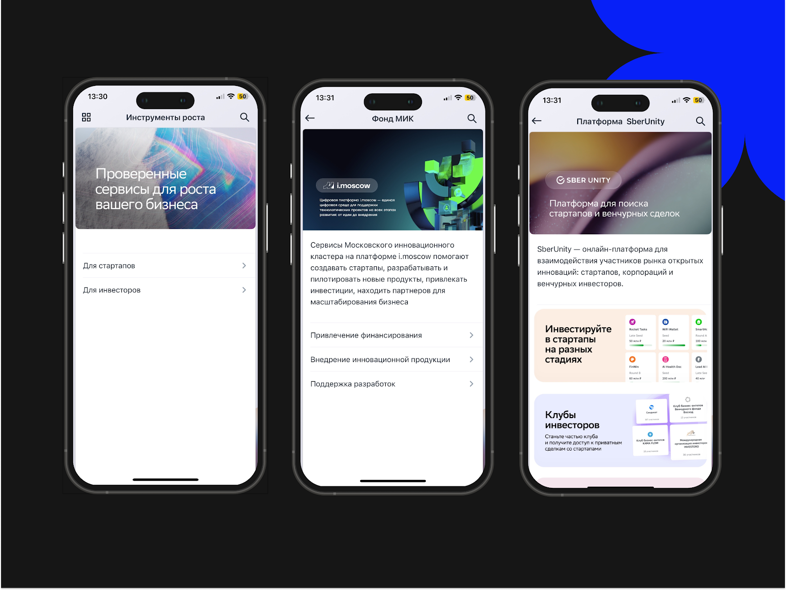 Так как одной из целей организаторов саммита является поддержка молодых стартапов, в приложение добавили раздел «Инструменты роста». В нём были представлены продукты и решения, направленные на помощь в разработке, пилотировании и поиске партнёров. Там же инвесторы знакомились с платформами для поиска единомышленников и привлечения капитала.